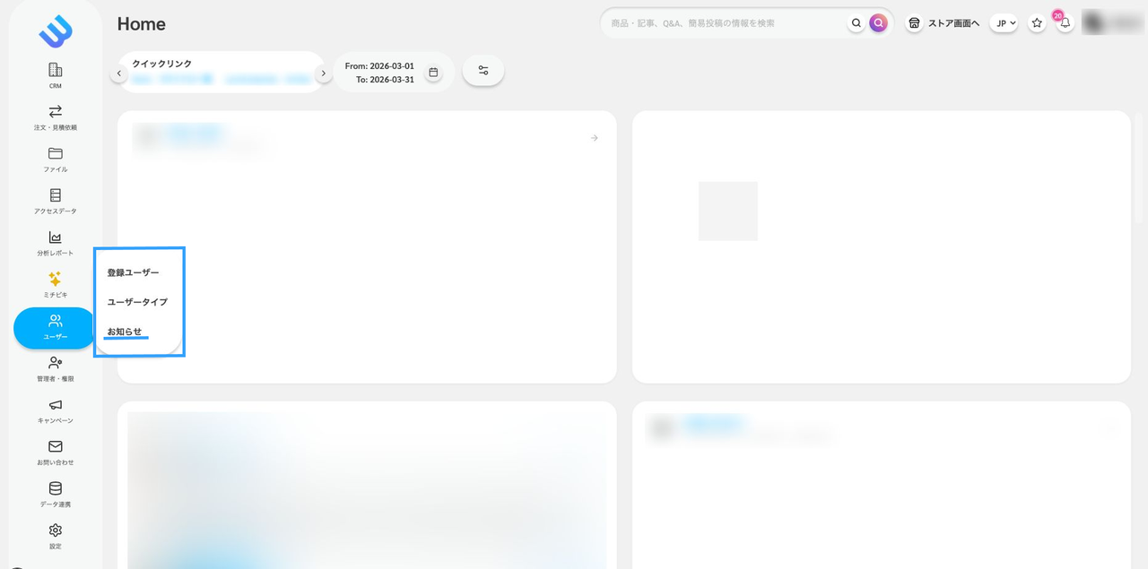 管理者ページのサブメニュー 「ユーザー」 内に 「お知らせ」 が存在します。