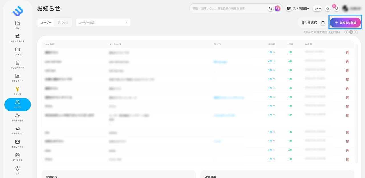 右上にある 「お知らせ作成」ボタン をクリックすると、新しいお知らせを作成できます。